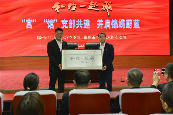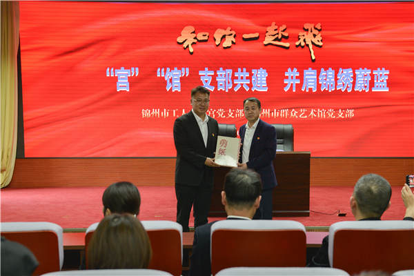 工人文化宮黨支部書(shū)記張家朋代表支部贈(zèng)送群眾藝術(shù)館黨支部的共建禮物(王丹先生題寫(xiě)的書(shū)法作品“和你一起飛”)