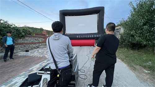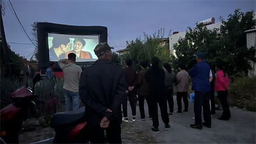 夜幕低垂、群星閃耀,村中央,一幅碩大的銀幕矗立在街道上,伴隨著錦州城市宣傳片和紅色歌曲MV的播放,現(xiàn)場(chǎng)圍觀的百姓無(wú)不拍手稱(chēng)贊。村上一位年逾古稀的大爺說(shuō):“我年輕的時(shí)候,公社也總來(lái)放電影,那時(shí)候周邊的村屯百姓無(wú)論多遠(yuǎn),黑燈瞎火的都過(guò)來(lái)看,像《地道戰(zhàn)》《地雷戰(zhàn)》《渡江戰(zhàn)役》啥的,一色兒的黑白片,那大伙兒看的都勁兒勁兒的。隨著社會(huì)在發(fā)展,現(xiàn)在的設(shè)備與效果都嘎嘎好,反而看的人少了,年輕人都外出打工,孩子也都不在家,村里大多數(shù)都是留守老人,除了忙農(nóng)活,就是自己找點(diǎn)樂(lè)兒,市里還能想著咱這些村民,上門(mén)兒放電影,太謝謝你們了!”深秋的鄉(xiāng)村,涼風(fēng)習(xí)習(xí),萬(wàn)籟俱寂,只有電影《祝你平安》的光亮與聲音劃破了這份寧?kù)o,同時(shí)也為這里的百姓帶來(lái)了貼心的問(wèn)候與溫情。