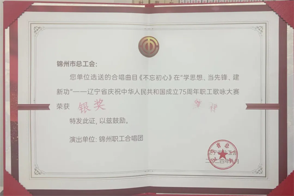 本次大賽匯聚了全省各地17支精英代表隊(duì),共計(jì)兩千五百余名參賽者,他們用嘹亮的歌聲詮釋了遼寧職工匯聚的磅礴力量,表達(dá)了對(duì)偉大祖國(guó)的深沉熱愛和崇高敬意。其中,錦州市總工會(huì)精心選拔組建的職工合唱團(tuán)憑借一曲深情演繹的《不忘初心》,榮獲大賽銀獎(jiǎng)。